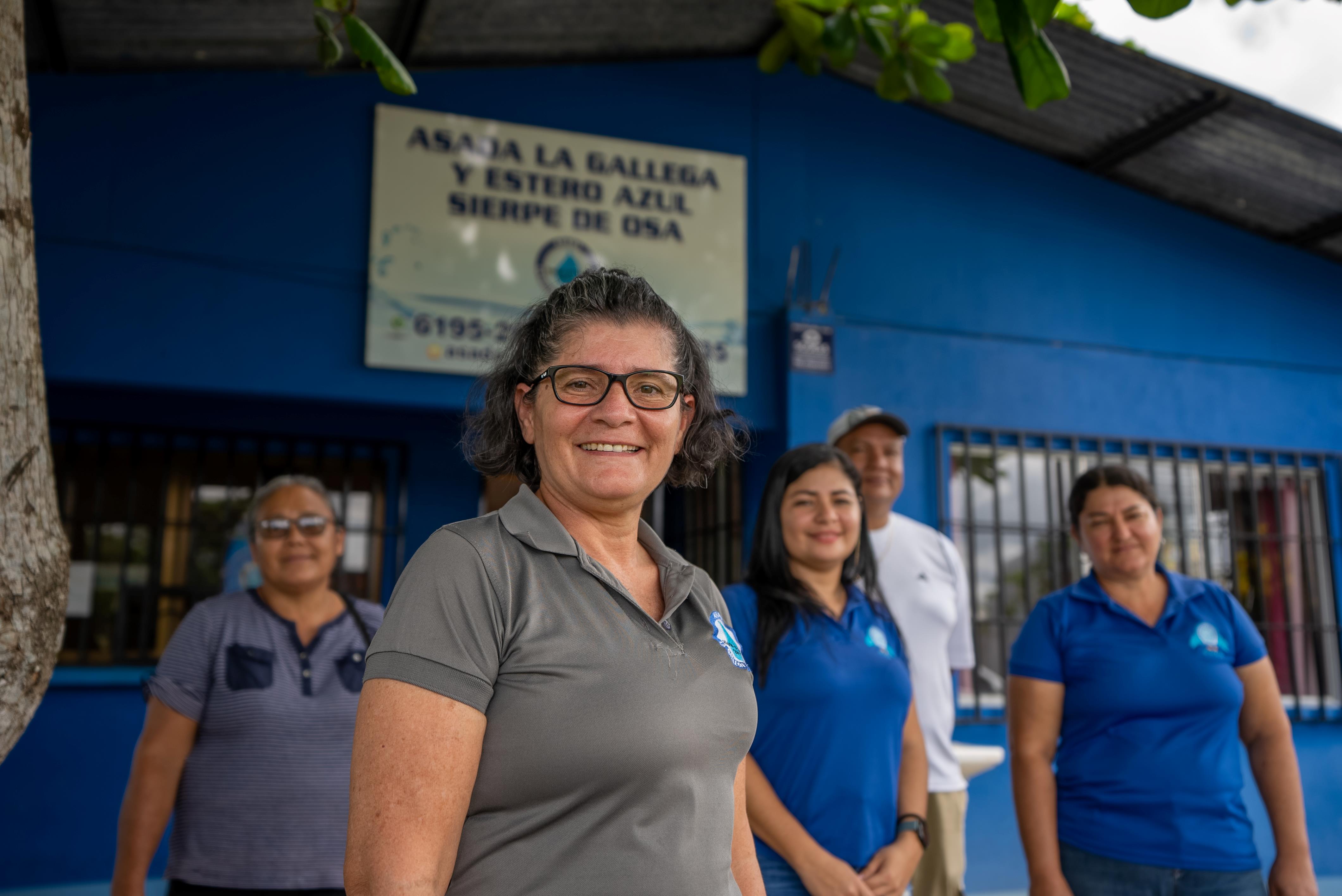Adriana Acuña frente a la ASADA La Gallega y Estero Azul de Sierpe de la Osa.